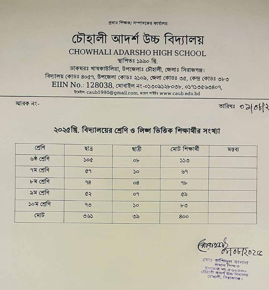 লিঙ্গ ও শ্রেণি ভিত্তিক শিক্ষার্থীর তথ্য