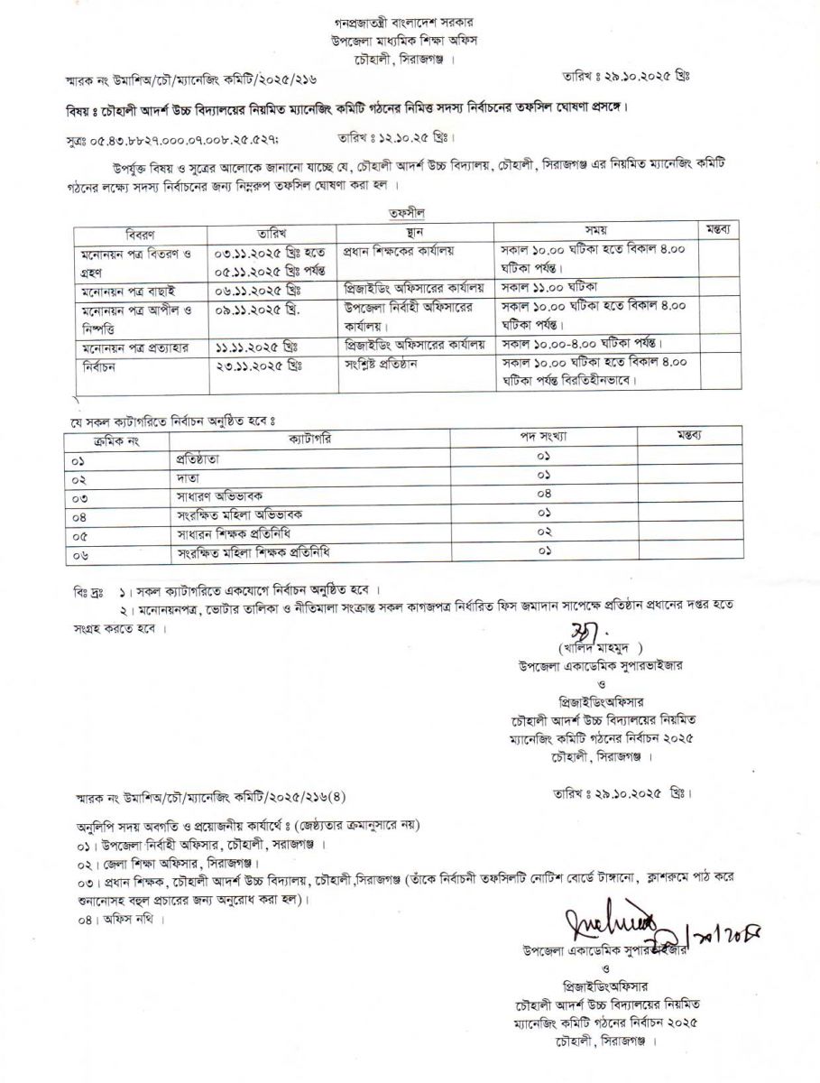 ম্যানেজিং কমিটির নির্বাচনী তফশীল-২০২৫ Published on Wednesday, October 29, 2025